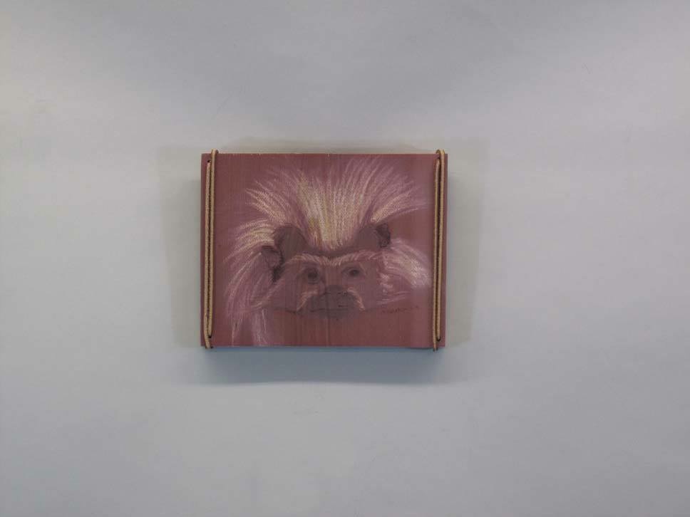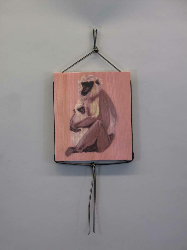 My sister drew these monkeys on a colored paper with pastel. wood print on cypress plank 9″x 9″.